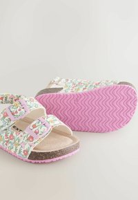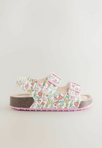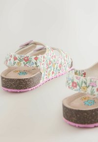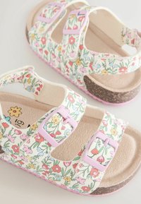 Sandały w kwiatowy wzór z dwoma regulowanymi różowymi klamrami, posiadające jasny wierzch i teksturowaną, korkopodobną brązową podeszwę.