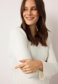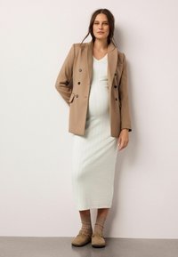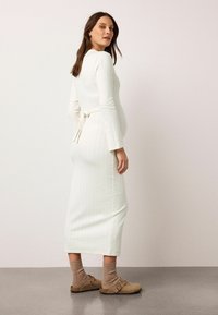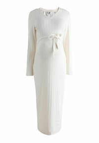 Sukienka ciążowa z długim rękawem wykonana z miękkiego białego prążkowanego materiału, z dekoltem w serek i wiązaniem w talii dla regulowanego dopasowania.