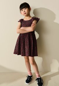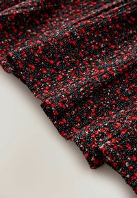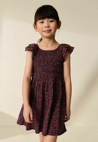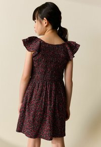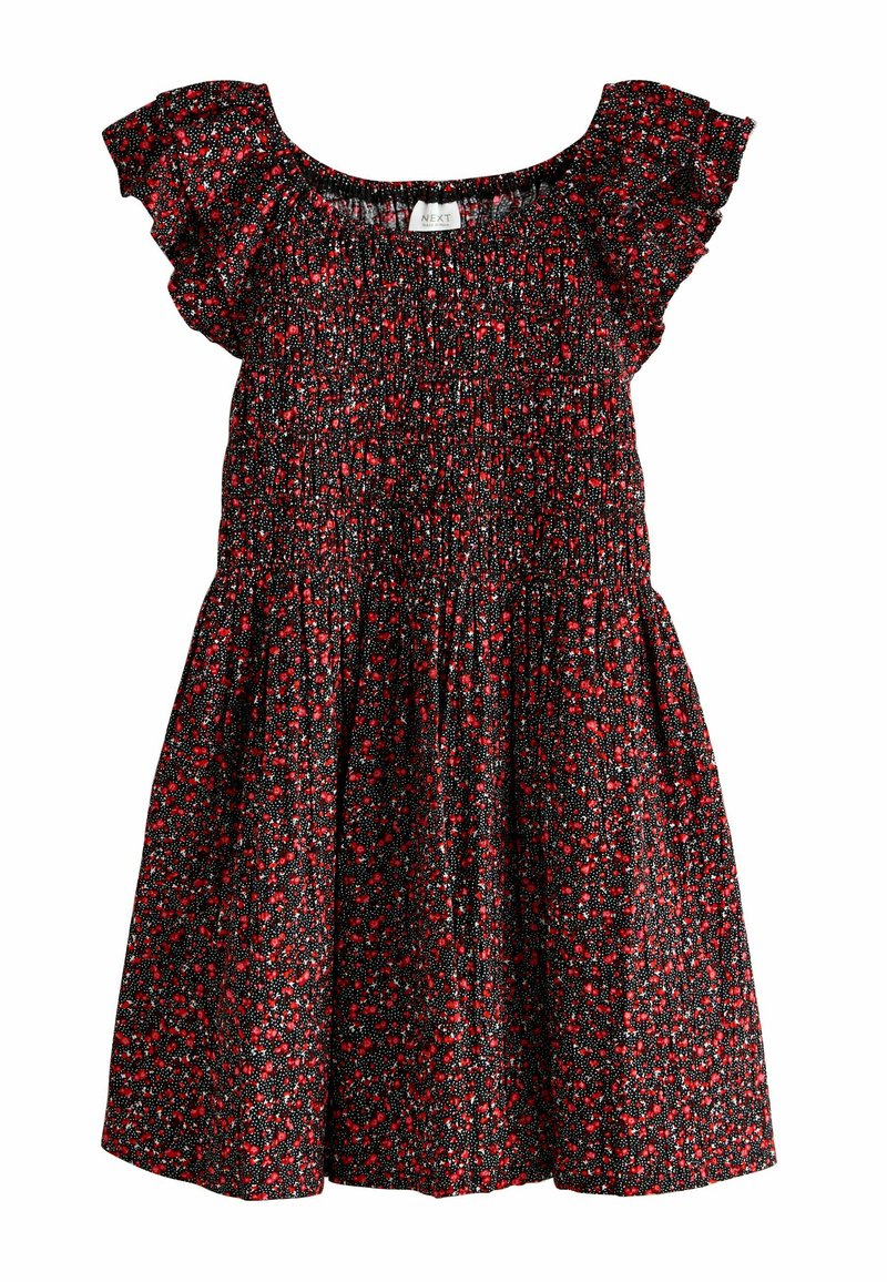Czarna sukienka w kwiaty z krótkimi falbanianymi rękawami, ozdobiona czerwonymi i białymi kwiatami na czarnym tle, z elastyczną talią i rozkloszowanym dołem.