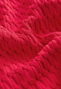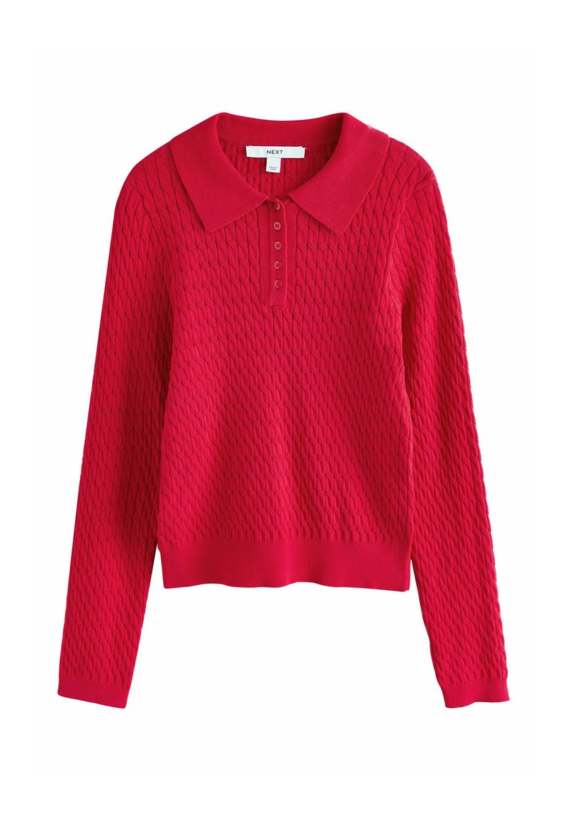 Czerwony, długi sweter z dzianiny z fakturowanym wzorem, kołnierzykiem polo i pięcioma guzikami na plisie.
