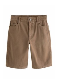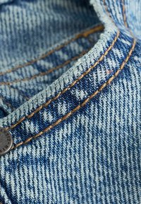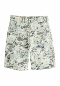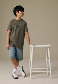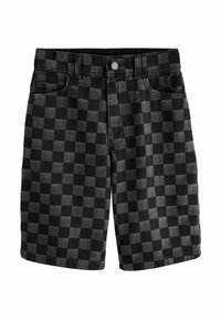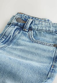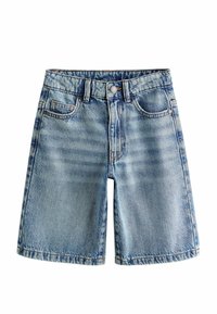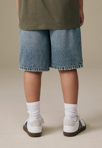 Szorty jeansowe o luźnym kroju i postrzępionym brzegu, zestawione z białymi skarpetkami za kostkę oraz białymi/srebrnymi butami sportowymi z czarnymi akcentami.