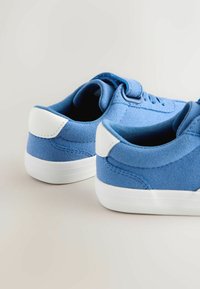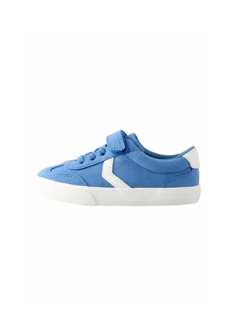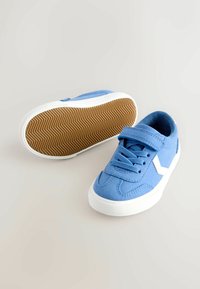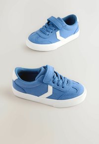 Niebieski dziecięcy tenisówka z białą podeszwą, białym detalem w kształcie zygzaka, sznurowadłami i paskiem na rzep na białym tle.