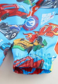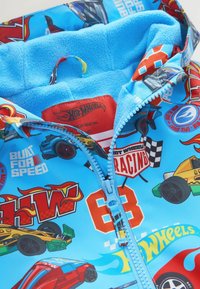 Niebieski kombinezon dla dzieci z kapturem, z nadrukami samochodów wyścigowych, numerem 68, napisem "Built for Speed" oraz logo Hot Wheels, zapinany z przodu na suwak, z elastycznymi mankietami.