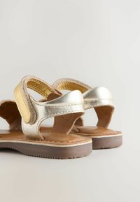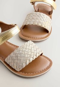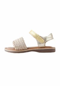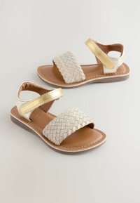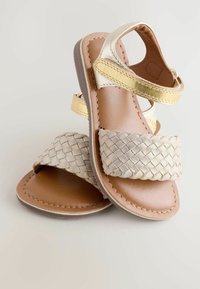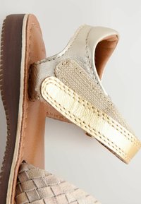 Płaska sandałka z jasnobrązowym plecionym przednim paskiem, złotym metalicznym paskiem wokół kostki i brązową podeszwą na białym tle.