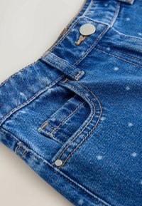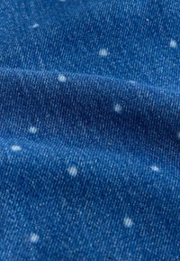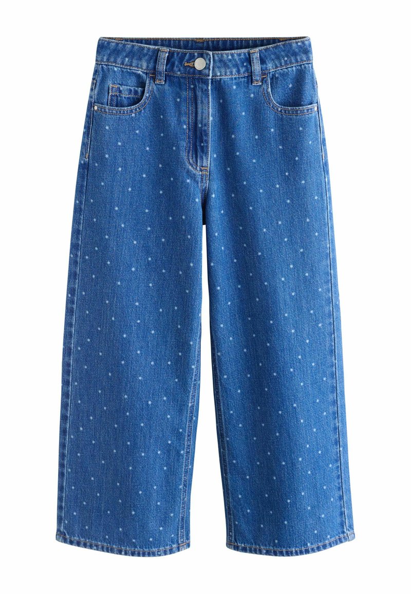 Niebieskie dżinsy o szerokich nogawkach w białe kropki, z przodem na guziki i zamek błyskawiczny, szlufkami na pasek oraz przednimi i małą kieszonką.