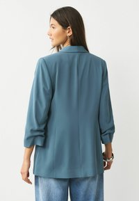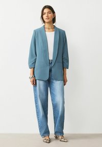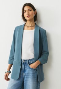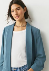 Kobieta ubrana w morski blezer na białej koszuli, jasnoniebieskie dżinsy, srebrny łańcuszek na szyi oraz masywną srebrną bransoletkę.