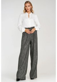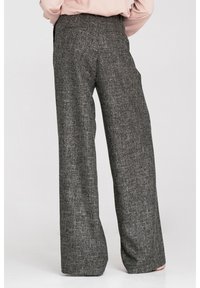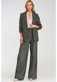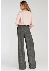Spodnie o szerokich nogawkach z teksturowanej szarej tkaniny z zakładkami, wysokim stanem i prostym krojem, zestawione z jasnoróżową bluzką.