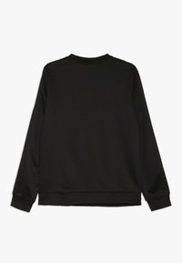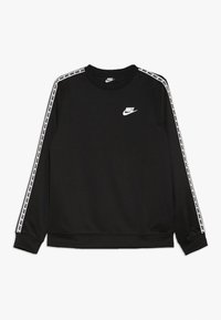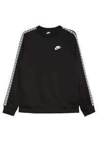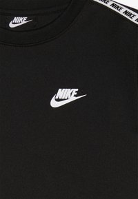 Czarna bluza Nike z długim rękawem, z białymi logo Nike na piersi oraz białą taśmą z logo biegnącą wzdłuż obu rękawów.