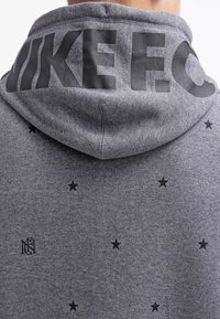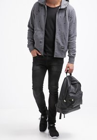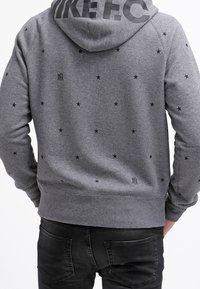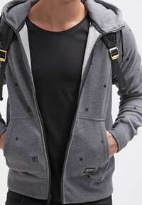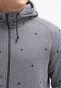 Szara bluza z kapturem na suwak, wykonana z miękkiego polaru, ozdobiona wzorem gwiazdek, z kapturem ze sznurkiem i przednimi kieszeniami. Zawiera czarne akcenty i naszywkę z logo.