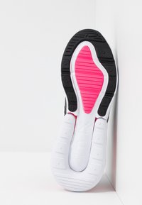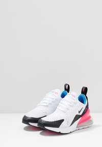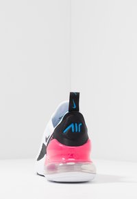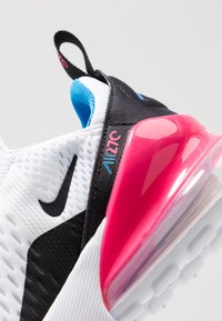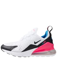 Para białych sportowych trampek z czarnymi akcentami, różowymi poduszkami powietrznymi na piętach, niebieską wyściółką wewnętrzną oraz logo Nike po bokach i na języku.