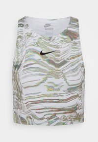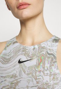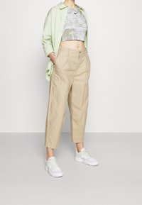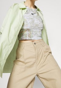 Szczupła osoba ubrana w krótki, bezrękawnikowy top Nike z marmurkowym wzorem oraz beżowe, szerokie spodnie z wysokim stanem, z ręką w kieszeni, widoczne tatuaże.