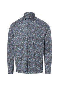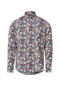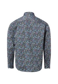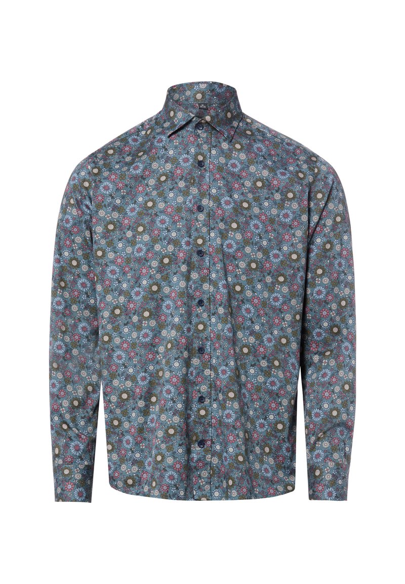 Koszula na guziki z długim rękawem, o niebieskim tle i gęstym kwiatowym wzorze w kolorach różowym, białym oraz oliwkowozielonym.