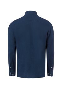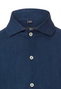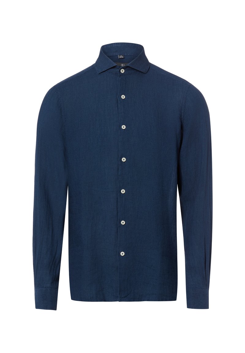 Granatowa, długorękawowa koszula na guziki z ostrym kołnierzykiem i siedmioma białymi guzikami z przodu.