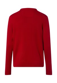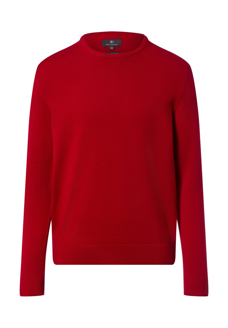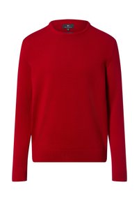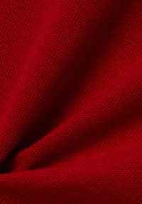 Czerwony dziany sweter z dekoltem typu crew neck, długimi rękawami oraz ściągaczami przy mankietach i dolnym brzegu. Gładka faktura i jednolity kolor bez wzorów.