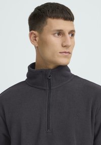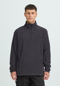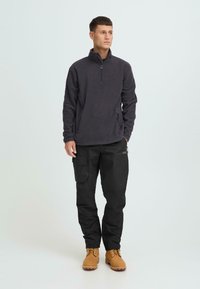 Młody mężczyzna z krótkimi włosami, ubrany w ciemnoszary polar z półzamkiem i czarne spodnie typu cargo, stoi na tle jasnego, jednolitego tła.