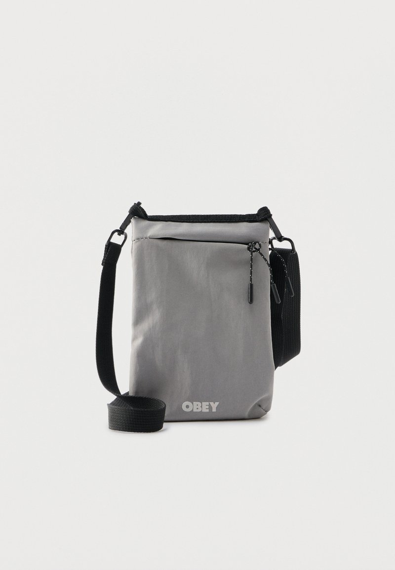 Szara torba na ramię z czarnym regulowanym paskiem, przednia kieszeń zapinana na suwak z troczkami oraz logo „OBEY” na dole, na środku.