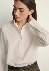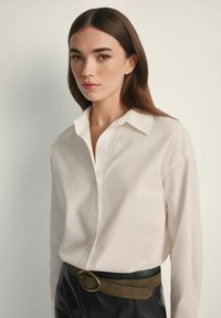 Młoda kobieta o długich brązowych włosach ubrana w białą koszulę zapinaną na guziki, wpuszczoną w czarne spodnie z brązowym paskiem, na jednolitym tle.