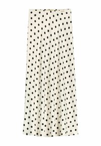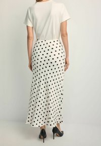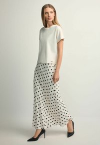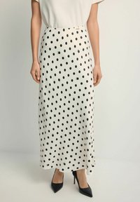 Kobieta ubrana w białą midi spódnicę w czarne kropki i małe motywy owadów, zestawioną z czarnymi szpiczastymi szpilkami i białym topem.