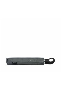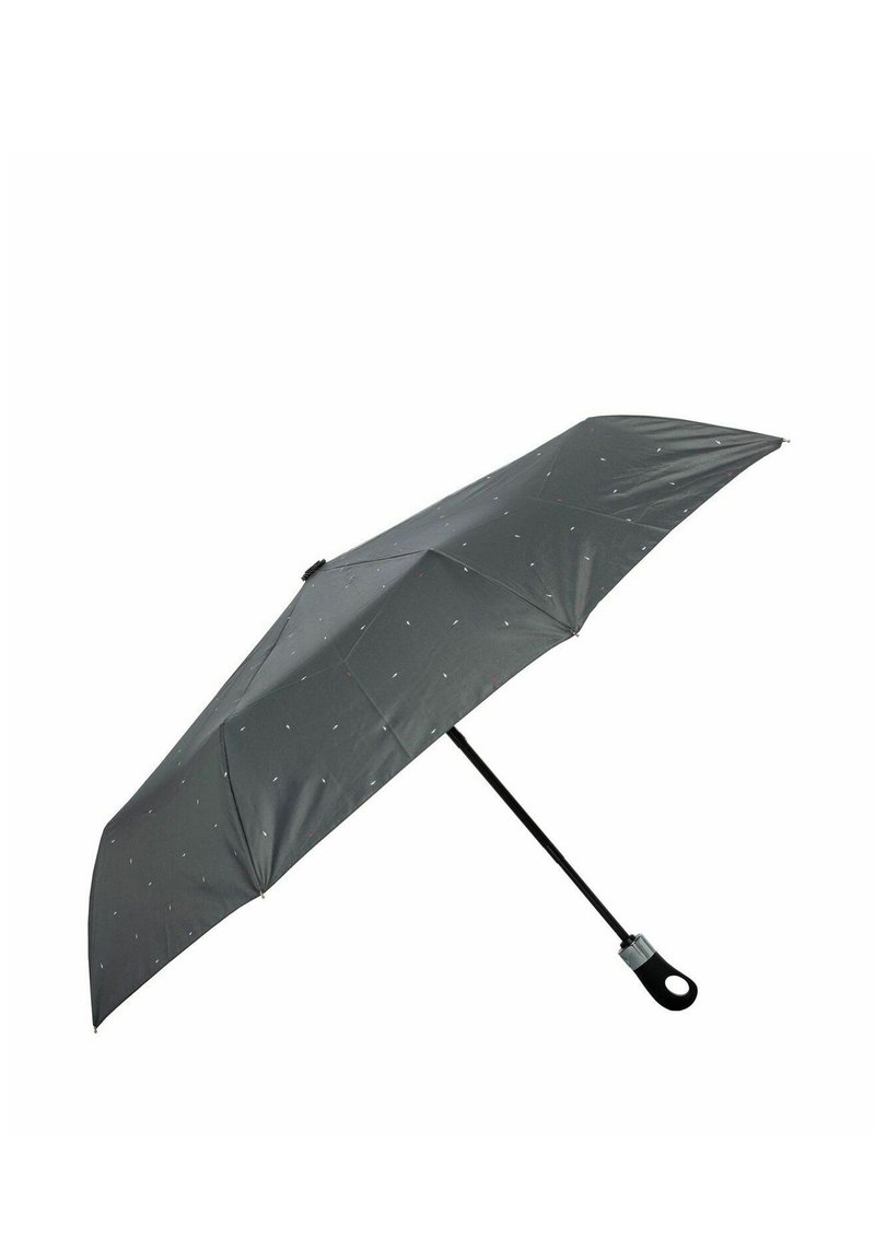 Kompaktowy czarny parasol w drobne białe kropki, z prostym trzonkiem i pętelkowym uchwytem, pokazany całkowicie otwarty na białym tle.