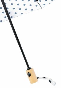 Biały parasol w czarne kropki, czarna trzonka i beżowa rączka z przyciskiem do otwierania i zamykania.