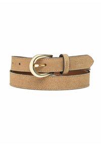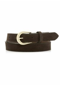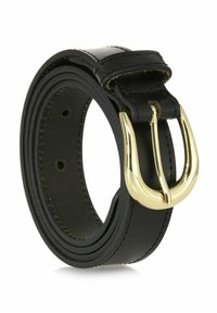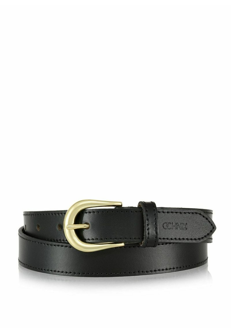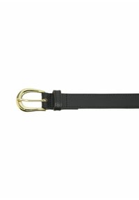 Czarny skórzany pasek z złotą metalową klamrą, obszyty na brzegach i z wytłoczonym nazwą marki w pobliżu końcówki, leżący płasko na białym tle.