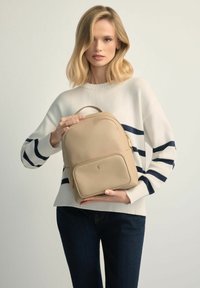 Kobieta o blond włosach, ubrana w biały sweter w czarne paski, trzyma beżowy skórzany plecak na jednolitym jasnym tle.