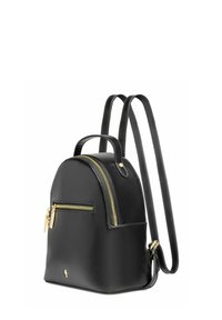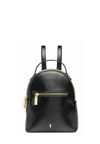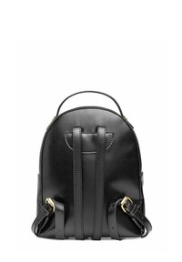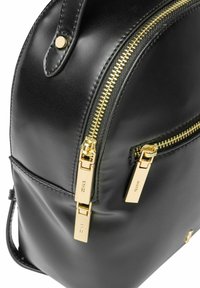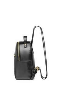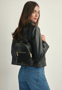 Kobieta o długich brązowych włosach, ubrana w czarną skórzaną kurtkę i niebieskie dżinsy, niesie mały czarny skórzany plecak z złotymi suwakami.