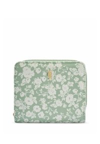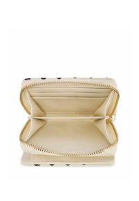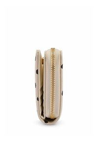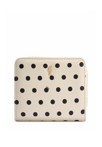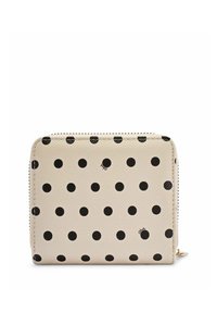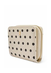 Beżowy portfel z czarnymi kropkami, teksturowaną powierzchnią, małym złotym emblematem ptaka i zamkiem błyskawicznym dookoła.