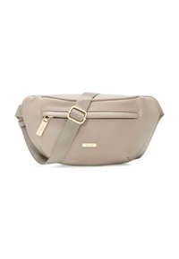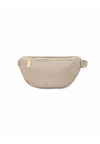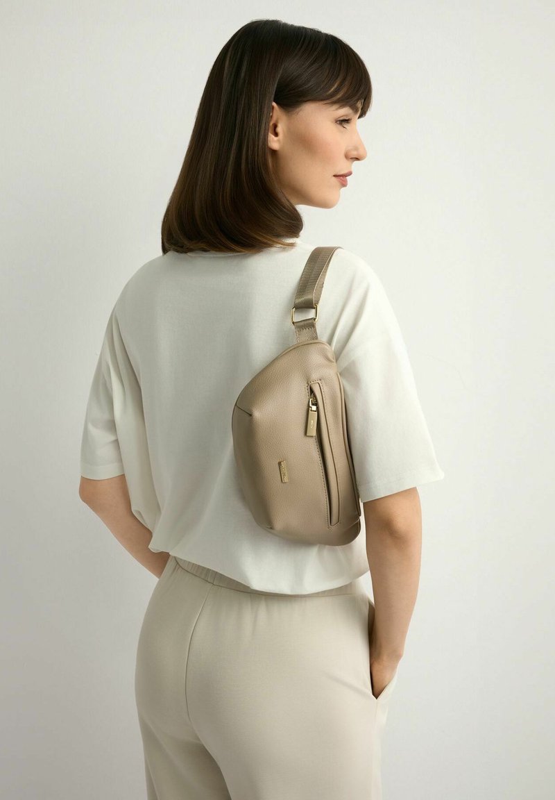 Kobieta ubrana w beżowy top z krótkim rękawem i spodnie, niosąca beżową skórzaną torebkę na ramię, stojąca na jednolitym tle.