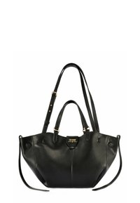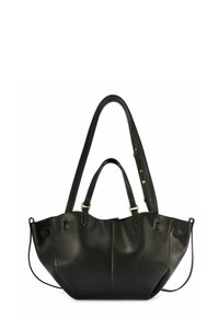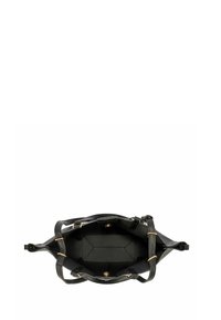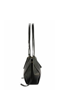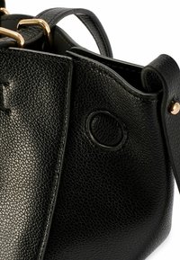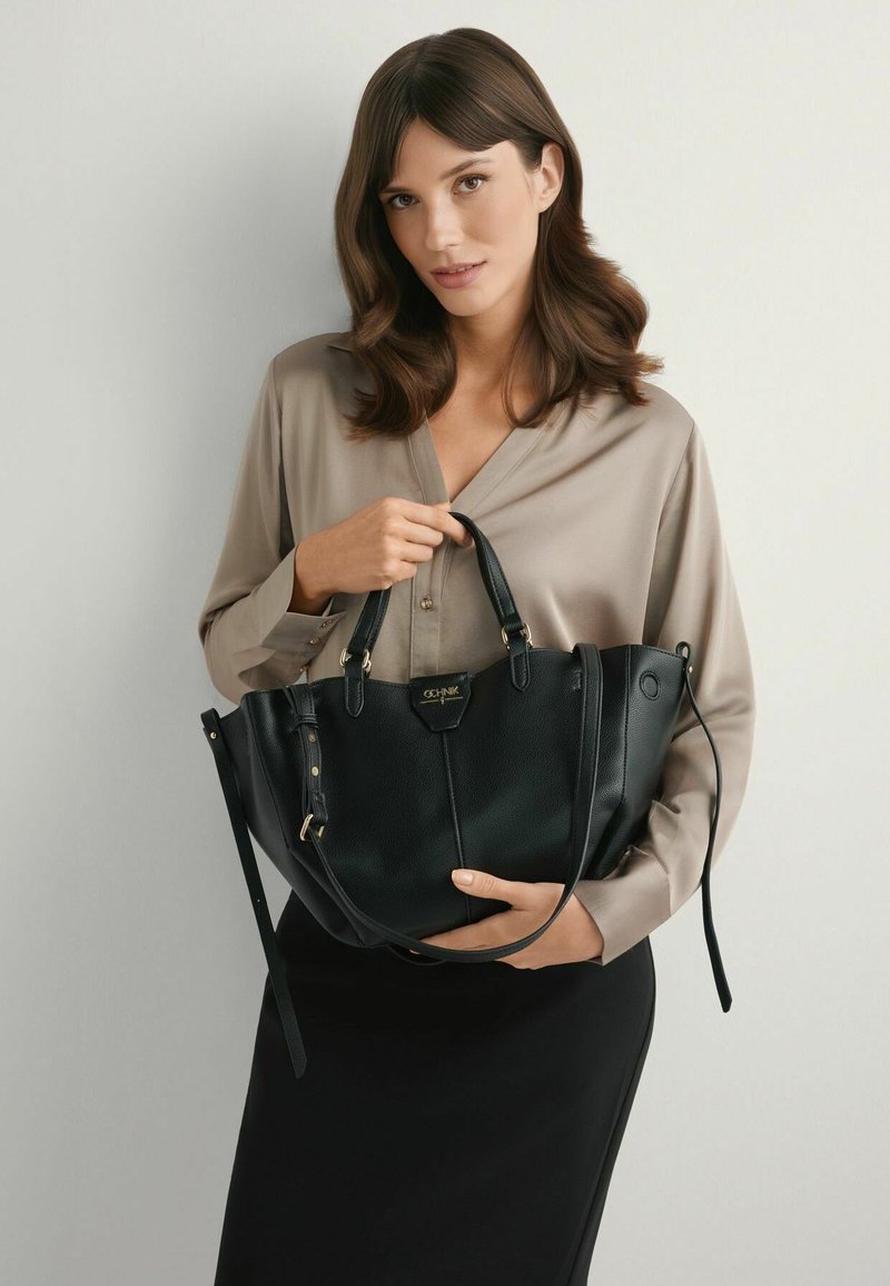 Kobieta o falowanych brązowych włosach ubrana w beżową bluzkę i czarną spódnicę, trzyma czarną skórzaną torbę na ramię z krótkimi uchwytami i paskiem na ramię.