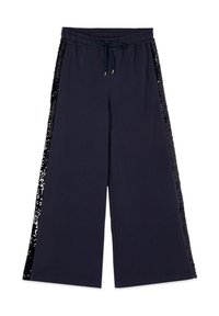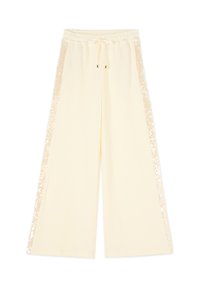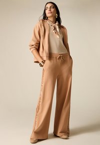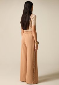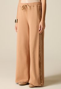 Beżowe spodnie o szerokich nogawkach z elastycznym pasem i sznurkiem, z cekinowym paskiem z boku, noszone z beżowymi mokasynami i złotą bransoletą.