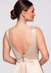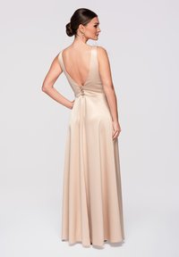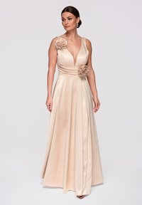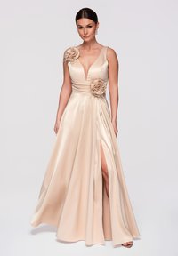 Kobieta w beżowej satynowej sukni z głębokim dekoltem w serek, ozdobiona kwiatowymi aplikacjami na ramieniu i talii oraz z rozporkiem sięgającym uda, stojąca na jasnym tle.