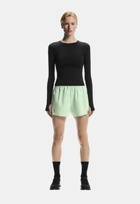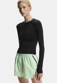 Blondynka w dopasowanym czarnym topie z długim rękawem i jasnozielonych sportowych szortach, stojąca z jedną ręką złożoną na klatce piersiowej.