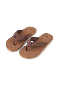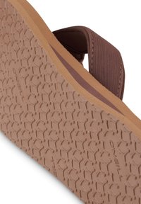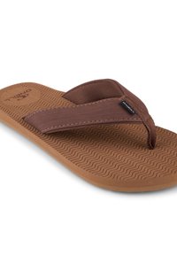 Brązowa męska klapka na plażę z teksturowaną jasnobrązową podeszwą i szerokim paskiem z tkaniny, prezentowana na białym tle.
