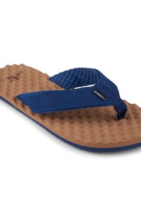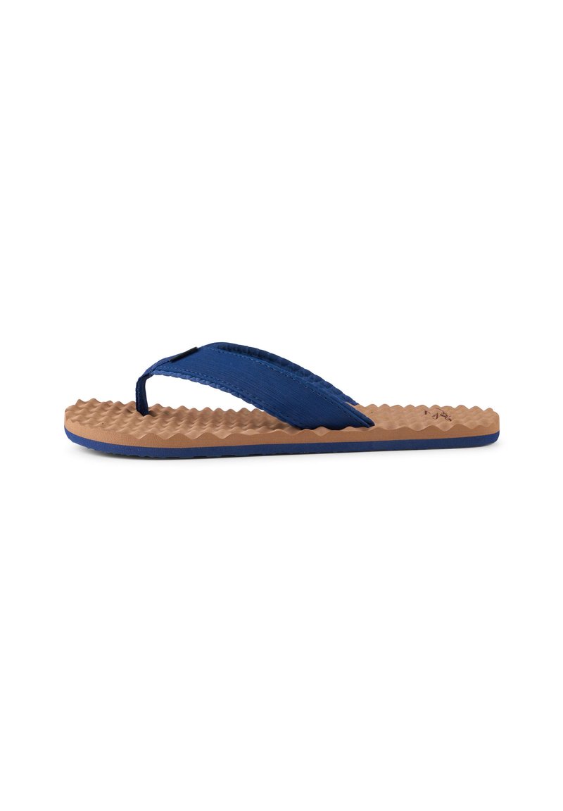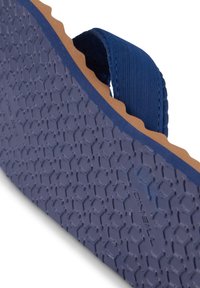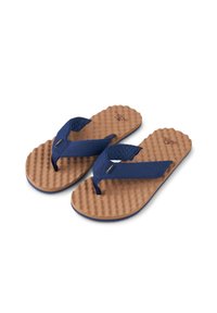 Brązowa teksturowana podeszwa klapka z szerokimi paskami z granatowej tkaniny i paskiem między palcami, pokazana z boku na białym tle.