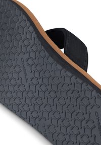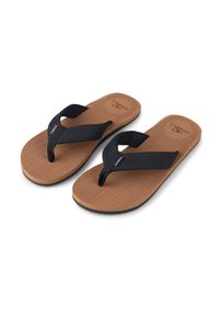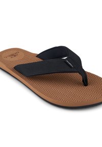 Brązowa, teksturowana podeszwa klapka z czarnymi paskami z tkaniny, widoczna z boku na białym tle.