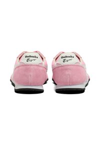 Niski profil różowego sneakersa z białymi paskami po bokach, sznurowanym zapięciem, zamszowym obcasem i czubkiem oraz czarną teksturowaną podeszwą.