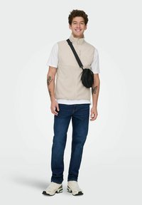 Młody mężczyzna z kręconymi włosami, ubrany w beżową kamizelkę na suwak na białej koszulce, niebieskie jeansy, czarna torba przewieszona przez ramię oraz widoczne tatuaże na ramionach.