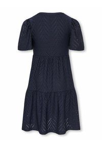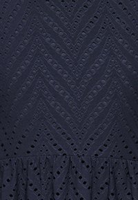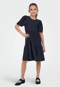 Młoda dziewczyna stoi z jedną ręką na biodrze, ubrana w czarną sukienkę midi z ażurowymi wzorami i czarne czółenka Mary Jane, uśmiecha się do aparatu na jednolitym tle.