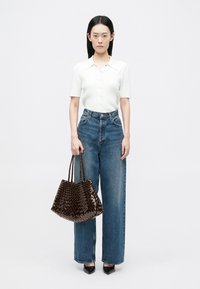 Brązowa skórzana kurtka na białej koszuli, zestawiona z jasnoniebieskimi spodniami o szerokich nogawkach. Trzyma ciemną plecioną torebkę. W tle miasta znajduje się kawiarnia.