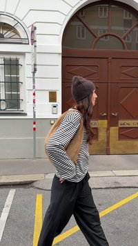 • Bluzka w czarno-białe paski z długim rękawem, luźne czarne spodnie w prążek, brązowa dzianinowa czapka i jasnobrązowa torba na ramię, stojąca na ulicy.