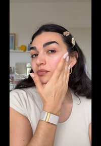 • Spinki do włosów w beżowym i srebrnym kolorze trzymają ciemne, falujące włosy. Skóra jest gładka, z naturalnym makijażem, podkreślającym delikatny kolor ust i złotą biżuterię.
