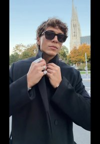 • Czarny płaszcz z wysokim kołnierzem, jasnoszara sweter, brązowe spodnie i brązowy pasek. Trzyma papierowy kubek z kawą. W tle widać miejskie otoczenie.