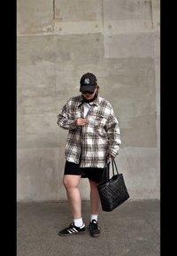 • Jasnobrązowa i biała koszula w kratę na białej koszulce, czarne szorty dżinsowe, czarne sneakersy, białe skarpetki do kostek i czarna pleciona torba.