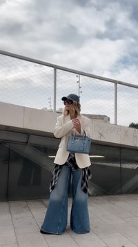 • Biały top bez rękawów, kremowa marynarka, oversize'owe dżinsy, a także koszula w kratę związana w talii. Niebieska torebka i dżinsowa czapka dopełniają całość.