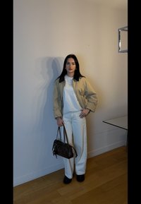 • Beżowa kurtka na zamek z czarnym kołnierzem na białym T-shircie z grafiką, w zestawieniu z białymi spodniami. Trzyma brązową torbę o puchatej strukturze. Złote pierścionki na ręce.