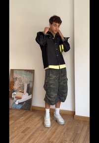 • Krótkie spodenki w kamuflażu z wieloma kieszeniami, w szaro-zielonych odcieniach, połączone z białymi skarpetkami i beżowymi butami wsuwanymi o pikowanym wzorze.