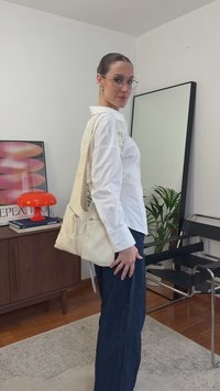 • Biała koszula z guzikami, w oversize'owym fasonie, noszona z ciemnymi szerokimi spodniami. Uzupełniona czarnymi okularami przeciwsłonecznymi i kremową torebką.