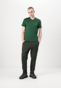 Różowa torba płócienna z białym napisem, noszona z białymi spodniami typu wide-leg i różową koszulką, na tle czerwonej ściany z logo.