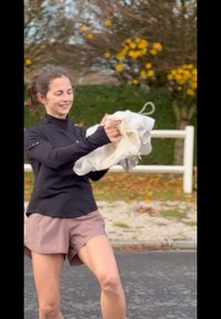 • Atletyczna kobieta rozciąga się, trzymając stopę z tyłu, ubrana w jasnoszarą kurtkę, brązowe szorty oraz białe skarpetki i buty do biegania.